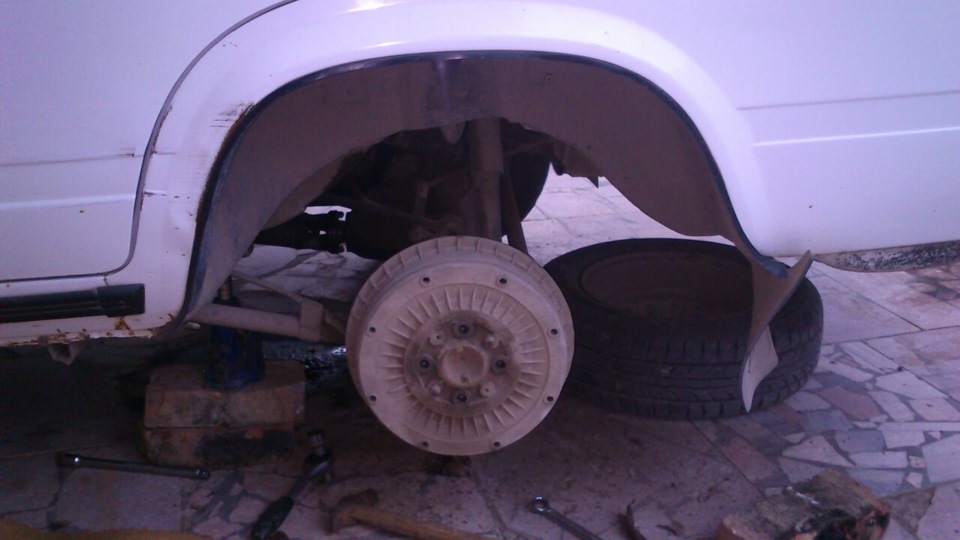 Перед тем как приступить к выполнению замены, следует подложить 2 башмака под колесо, находящееся по диагонали от снимаемого. Замена задних пружин начинается с откручивания и снятия колеса, после чего под конец балки заднего моста надо подставить колодку и опустить домкрат. Машина всей массой ляжет на колодку и сожмет пружину. Колодка должна стоять таким образом, чтобы не мешать откручиванию нижнего крепления амортизатора. Дальше по инструкции.