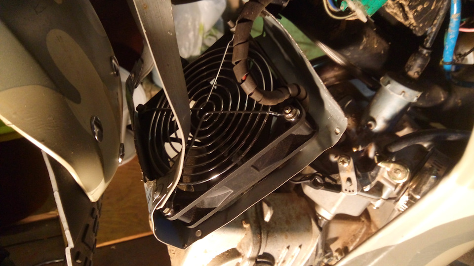 Дальше из изменений. Ножной тормоз перенес на левую рукоятку, по бездорожью нужны обе ноги. Докупил подшипников в запас, но пока не менял, родные ходят. Ну и поставил вентилятор от компа, включается вместо дальнего света.