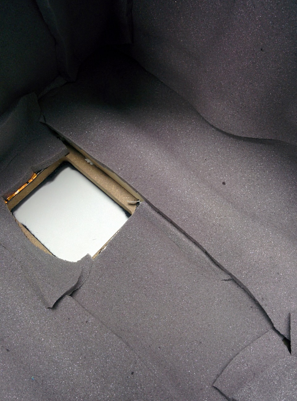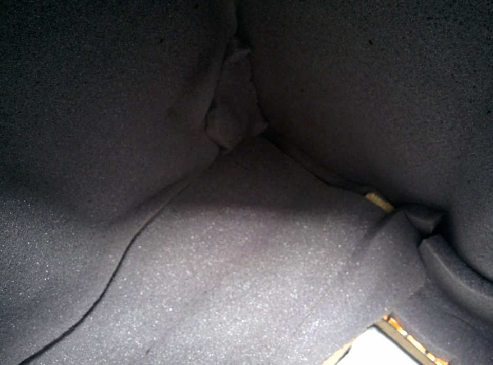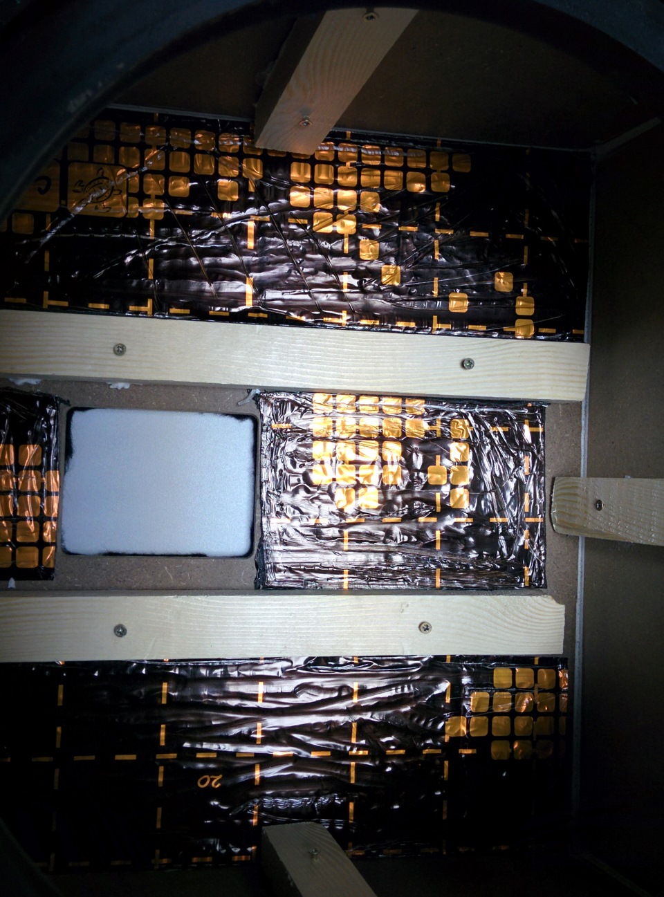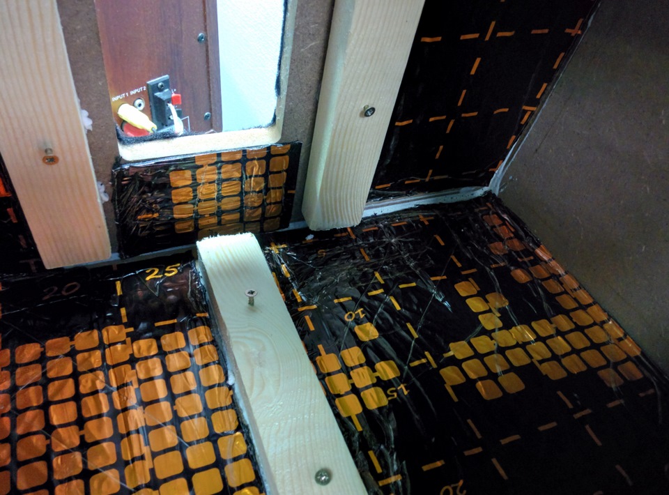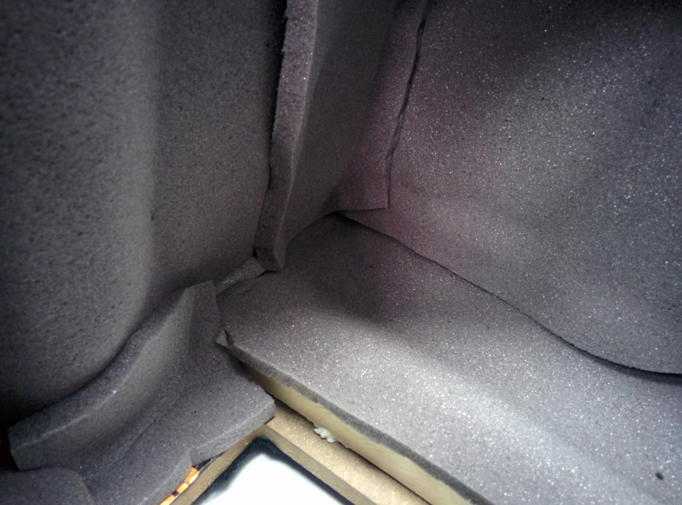 1. Сильные вибрации стенок корпуса порождают неприятные призвуки. Создается впечатление, что сабвуфер «бубнит на одной ноте». Хорошим лечением этого была бы распорка (или несколько между всеми стенками), но, к сожалению, поставить как следует распорки не получилось (но можно попробовать — хуже не будет). Поэтому я оклеил стенки специальным вибропоглотителем StP, а сверху еще слоем 8-мм изолона на герлене. На фото виден только изолон — материал StP под ним.