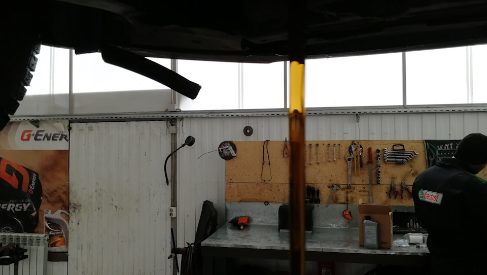 Двигатель выключен, автомобиль в горизонтальном положении, снята защита картера. Рычаг селектора в паркинге.